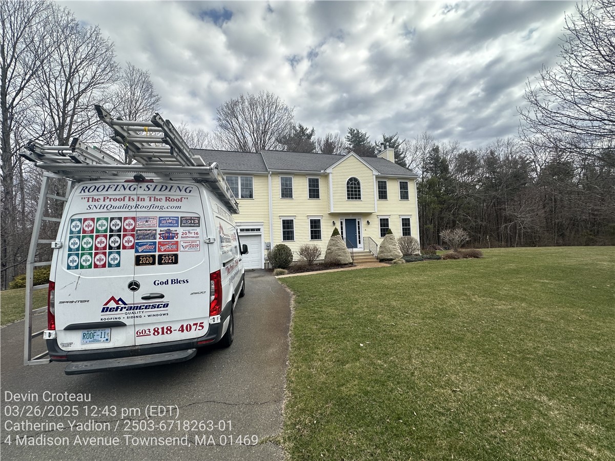 DeFrancesco Quality Roofing & Siding completed a full roof replacement on this Massachusetts home using CertainTeed’s Landmark Pro shingles in Georgetown Gray. We removed the aging roofing system, inspected the deck, and installed new underlayment and flashing to ensure long-term protection. The Landmark Pro shingles provide enhanced durability, algae resistance, and a bold architectural look. The striking finish adds contrast against the home’s light exterior, delivering improved curb appeal and reliable, high-performance weather protection for years to come.
